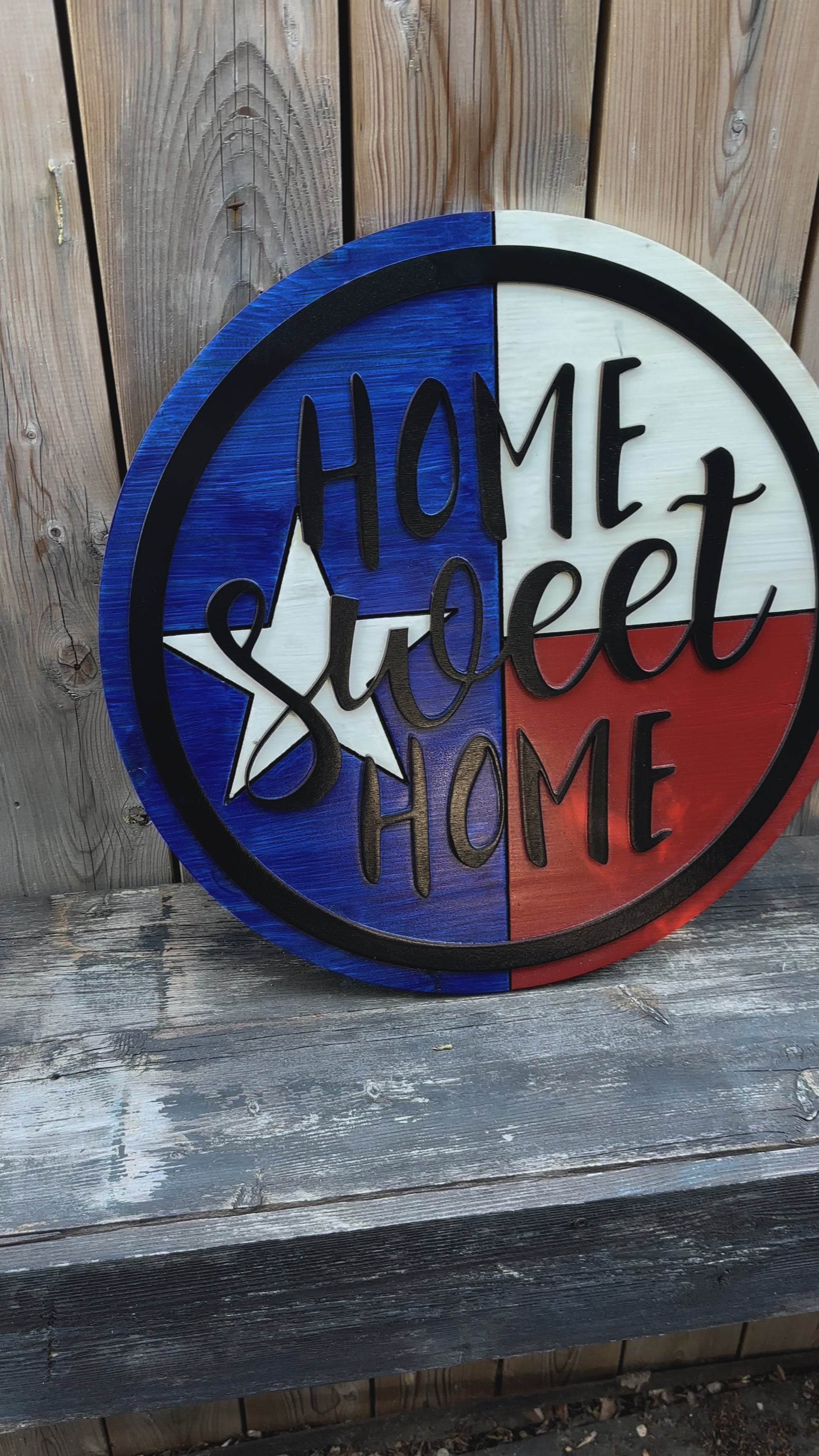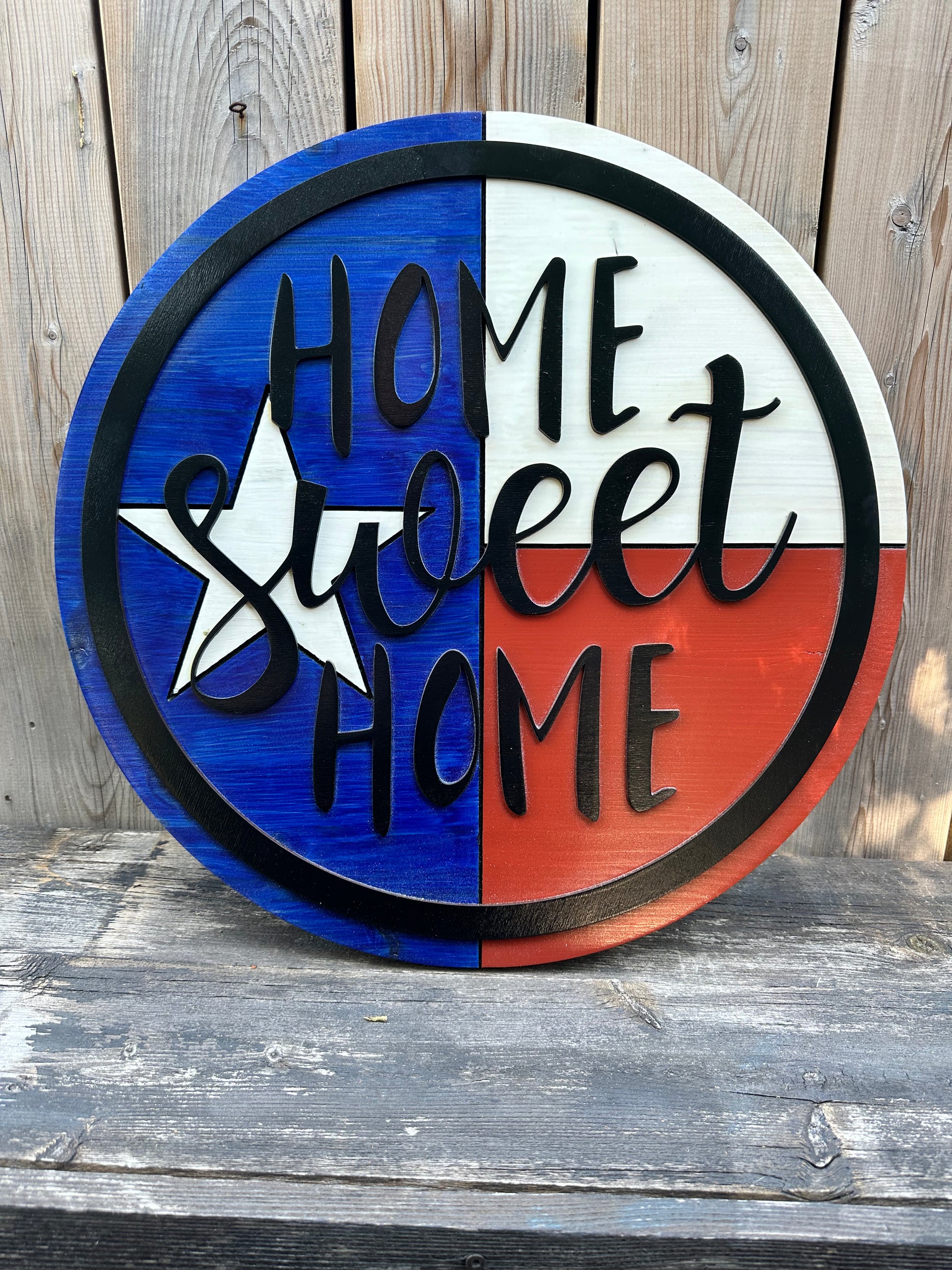 This is the first sign in our Texas collection. This home sweet home sign would look great by anyone’s front door. It’s clear coated for outdoor and indoor display. It’s a 19” circle cut out of premium pine and the Texas flag is carved into the wood then stained the good old red, white and blue. The top layer is cut out of Baltic birch and stained black and attached on top to give it the 3D look.