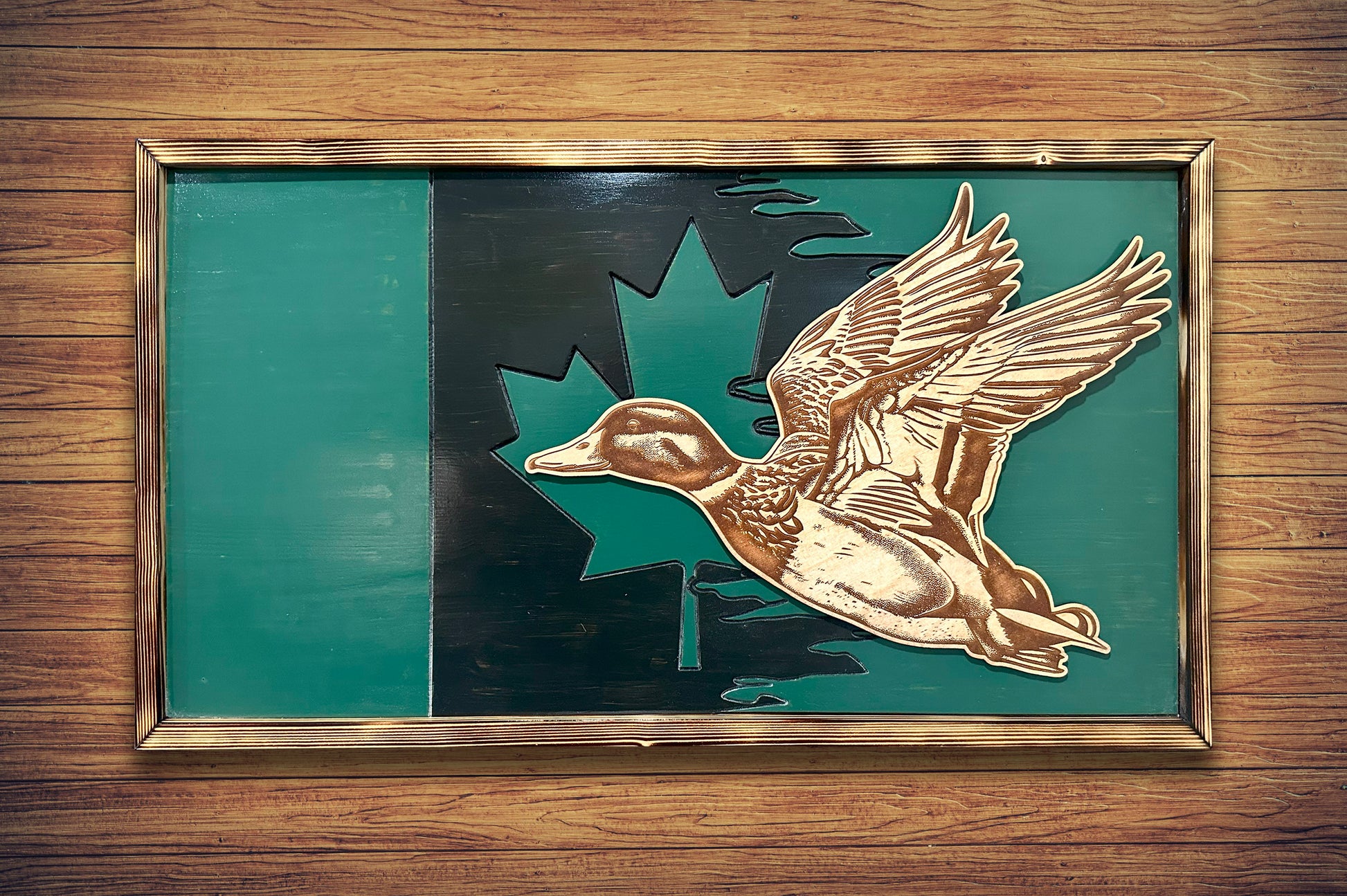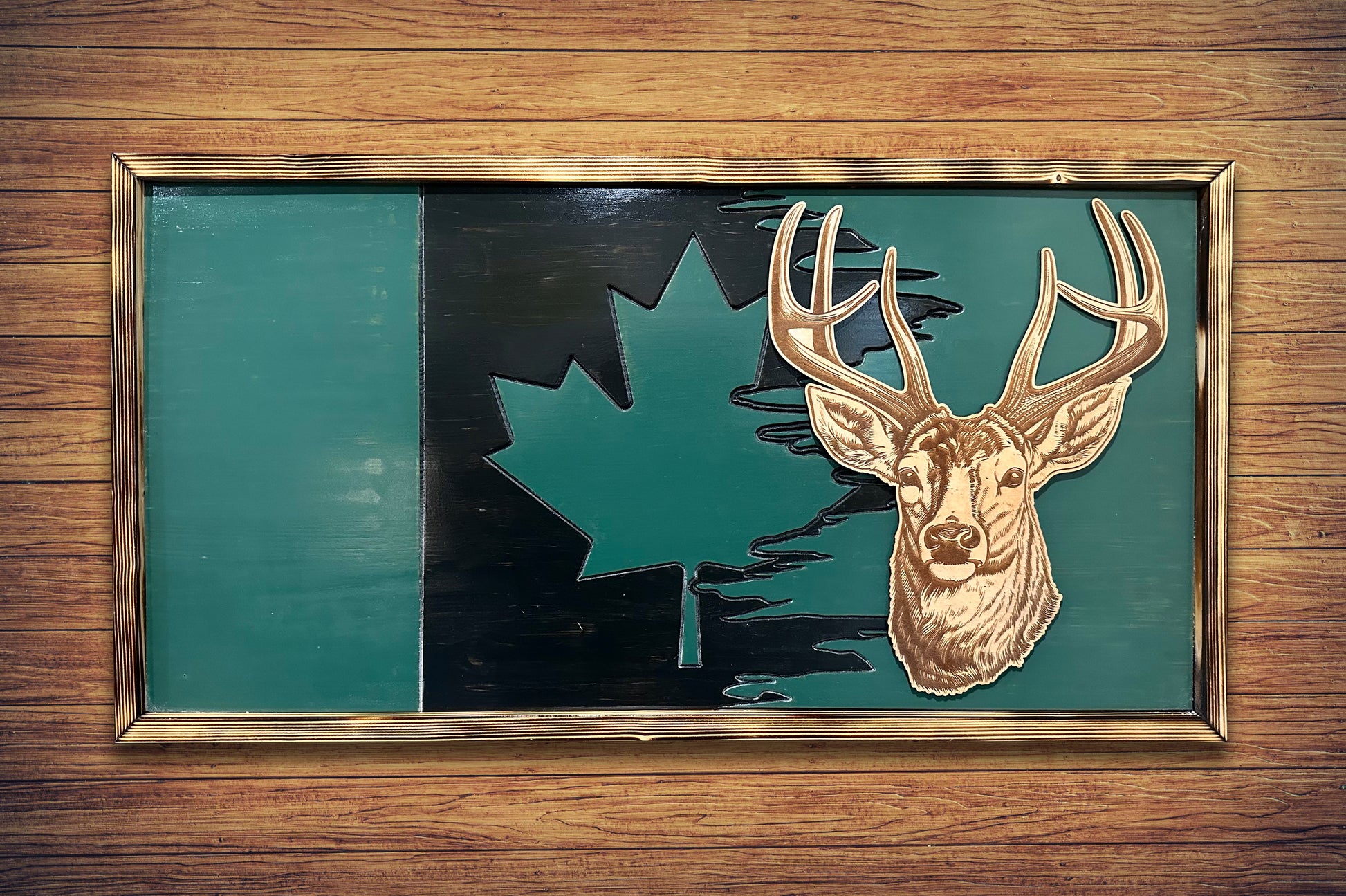 The Outdoorsman Canadian Flag is a must-have for all outdoor enthusiasts. This 16"x32" wood flag features a realistic animal engraving and comes with attached hardware for easy hanging inside or outside. Show your love for Canada and the great outdoors with this unique and durable flag.